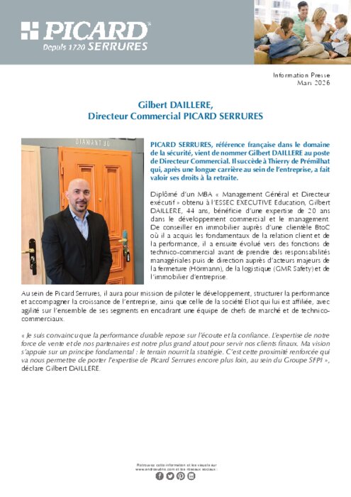 PICARD SERRURES, référence française dans le domaine de la sécurité, vient de nommer Gilbert DAILLERE au poste de Directeur Commercial. Il succède à Thierry de Prémilhat qui, après une longue carrière au sein de l’entreprise, a fait valoir ses droits à la retraite.