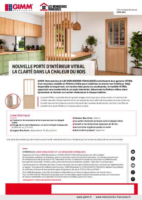 GIMM Menuiseries et LES MENUISERIES FRANÇAISES enrichissent leur gamme VITRAL d’un nouveau modèle en finition chêne pour sublimer et ancrer son intérieur. Déjà disponible en laqué noir, en version bloc-porte ou coulissante, le modèle VITRAL apportait une modernité et un style industriel, désormais la finition chêne vient dynamiser et donner un cachet chaleureux à chaque habitat.