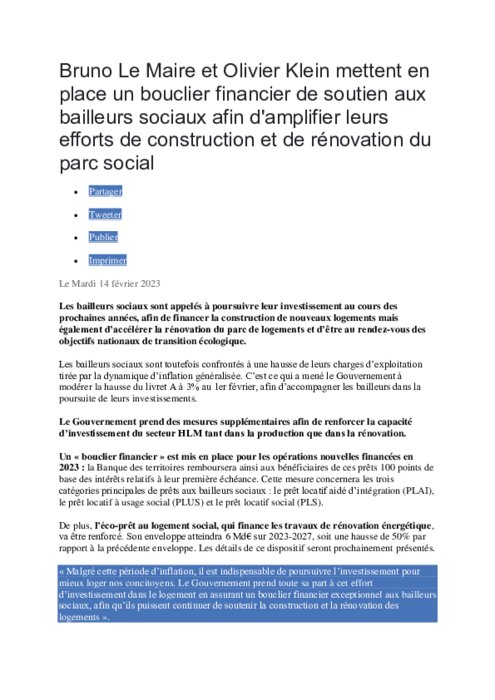Un « bouclier financier » est mis en place pour les opérations nouvelles financées en 2023 : la Banque des territoires remboursera ainsi aux bénéficiaires de ces prêts 100 points de base des intérêts relatifs à leur première échéance. Cette mesure concernera les trois catégories principales de prêts aux bailleurs sociaux : le prêt locatif aidé d’intégration (PLAI), le prêt locatif à usage social (PLUS) et le prêt locatif social (PLS).