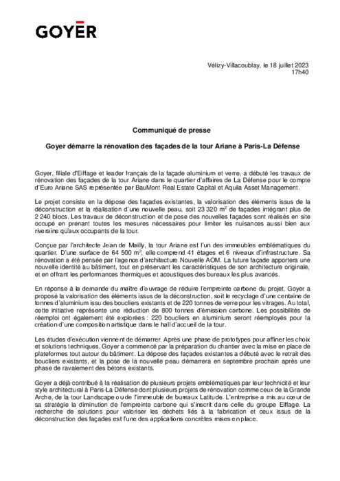 Goyer, filiale d’Eiffage et leader français de la façade aluminium et verre, a débuté les travaux de rénovation des façades de la tour Ariane dans le quartier d’affaires de La Défense pour le compte d’Euro Ariane SAS représentée par BauMont Real Estate Capital et Aquila Asset Management.