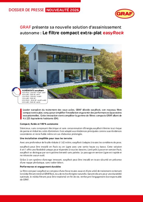 Leader européen du traitement des eaux usées, GRAF dévoile easyRock, son nouveau filtre compact extra-plat, conçu pour simplifier l’installation et garantir des performances épuratoires exceptionnelles. Cette innovation vient compléter la gamme de filtres compacts GRAF allant de 4 à 225 équivalents habitants (EH).