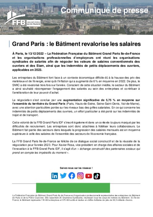 La Fédération Française du Bâtiment Grand Paris Ile-de-France et les organisations professionnelles d’employeurs ont réuni les organisations syndicales de salariés afin de négocier les valeurs de salaires conventionnels des ouvriers et des Etam, ainsi que les indemnités de petits déplacements des ouvriers, applicables en 2023.
