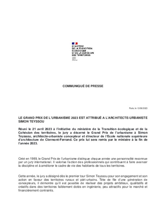 Réuni le 21 avril 2023 à l’initiative du ministère de la Transition écologique et de la Cohésion des territoires, le jury a décerné le Grand Prix de l’urbanisme à Simon Teyssou, architecte-urbaniste concepteur et directeur de l’Ecole nationale supérieure d’architecture de Clermont-Ferrand. Ce prix lui sera remis par le ministre à la fin de l’année 2023.