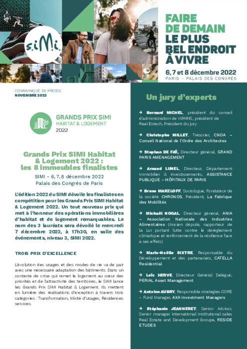 L’édition 2022 du SIMI dévoile les finalistes en compétition pour les Grands Prix SIMI Habitat & Logement 2022. Un tout nouveau prix qui met à l’honneur des opérations immobilières d’habitat et de logement remarquables. Le nom des 3 lauréats sera dévoilé le mercredi 7 décembre 2022, à 17h30, en salle des événements, niveau 3, SIMI 2022.