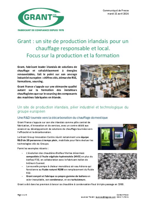 Industriels 23 avril 2026 - 12:22 Grant, fabricant leader irlandais de solutions de chauffage et rafraichissement à énergies renouvelables, fait le point sur son ancrage industriel européen : chiffres clés, démarche RSE, formations, sourcing. PDF (480 Ko) Télécharger