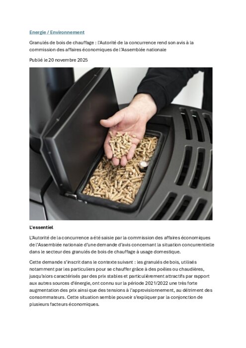 L’Autorité de la concurrence a été saisie par la commission des affaires économiques de l’Assemblée nationale d’une demande d’avis concernant la situation concurrentielle dans le secteur des granulés de bois de chauffage à usage domestique. Cette demande s’inscrit dans le contexte suivant : les granulés de bois, utilisés notamment par les particuliers pour se chauffer grâce à des poêles ou chaudières, jusqu’alors caractérisés par des prix stables et particulièrement attractifs par rapport aux autres sources d’énergie, ont connu sur la période 2021/2022 une très forte augmentation des prix ainsi que des tensions à l’approvisionnement, au détriment des consommateurs. Cette situation semble pouvoir s’expliquer par la conjonction de plusieurs facteurs économiques.