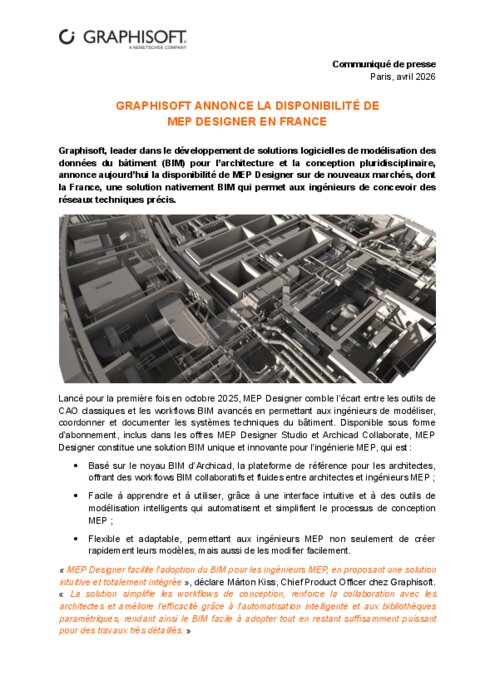 Graphisoft, leader dans le développement de solutions logicielles de modélisation des données du bâtiment (BIM) pour l’architecture et la conception pluridisciplinaire, annonce aujourd’hui la disponibilité de MEP Designer sur de nouveaux marchés, dont la France, une solution nativement BIM qui permet aux ingénieurs de concevoir des réseaux techniques précis.