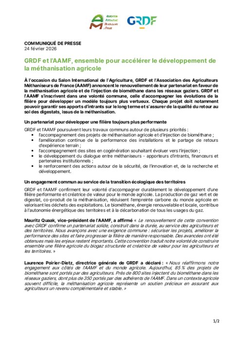 À l’occasion du Salon International de l’Agriculture, GRDF et l’Association des Agriculteurs Méthaniseurs de France (AAMF) annoncent le renouvellement de leur partenariat en faveur de la méthanisation agricole et de l’injection de biométhane dans les réseaux gaziers. GRDF et l’AAMF s’inscrivent dans une volonté commune, celle d’accompagner les évolutions de la filière pour développer un modèle toujours plus vertueux. Chaque projet doit notamment pouvoir garantir ses apports d’intrants sur le long terme et s’assurer de la qualité du retour au sol des digestats, issus de la méthanisation.