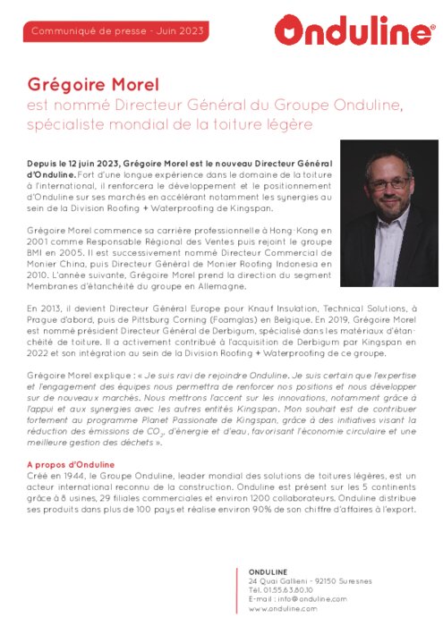 Depuis le 12 juin 2023, Grégoire Morel est le nouveau Directeur Général d’Onduline. Fort d’une longue expérience dans le domaine de la toiture à l’international, il renforcera le développement et le positionnement