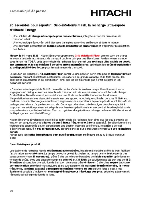 Hitachi Energy propose avec Grid-eMotion Flash une solution de charge innovante destinée aux réseaux de transport public urbain par bus électriques. Anciennement connue sous le nom de TOSA, cette technologie de recharge flash permet une recharge ultra-rapide au dépôt, aux terminaux et le cas échéant à certains arrêts intermédiaires, optimisant les coûts d’exploitation et la disponibilité des flottes pour les opérateurs de transport.