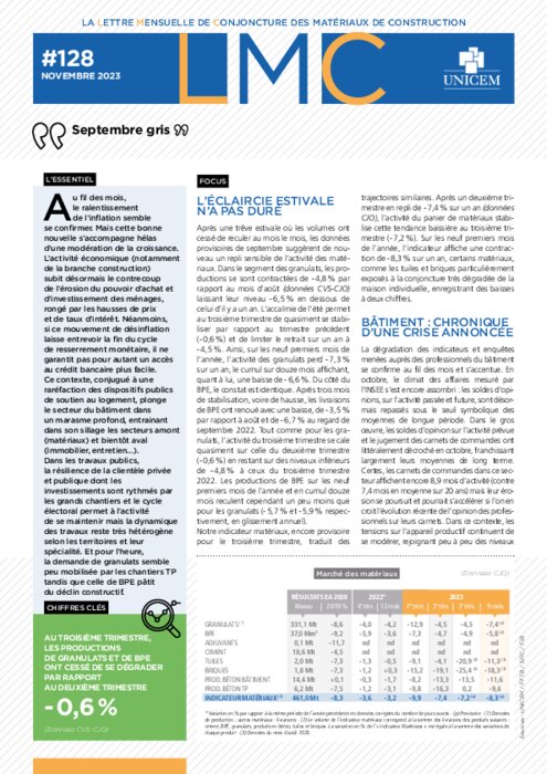Institutionnels 21 novembre 2023 - 10:36 Après une trêve estivale où les volumes ont cessé de reculer au mois le mois, les données provisoires de septembre suggèrent de nouveau un repli sensible de l’activité des matériaux... PDF (142 Ko) Télécharger