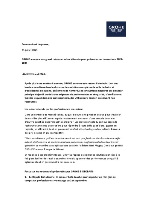 Après plusieurs années d’absence, Grohe annonce son retour à Ideobain. L’un des leaders mondiaux dans le domaine des solutions complètes de salle de bains et d'accessoires de cuisine, présentera de nombreuses innovations majeures qui ont pour principal objectif, au-delà des exigences de performances et de qualité, d'améliorer et faciliter le quotidien des professionnels, des utilisateurs, tout en préservant nos ressources.