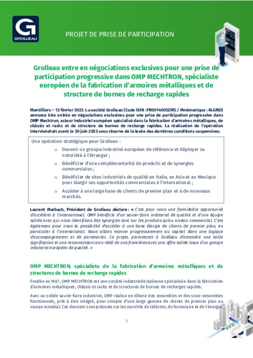 La société Grolleau annonce être entrée en négociations exclusives pour une prise de participation progressive dans OMP Mechtron, acteur industriel européen spécialisé dans la fabrication d’armoires métalliques, de châssis et racks et de structure de bornes de recharge rapides. La réalisation de l’opération interviendrait avant le 30 juin 2023 sous réserve de la levée des dernières conditions suspensives.