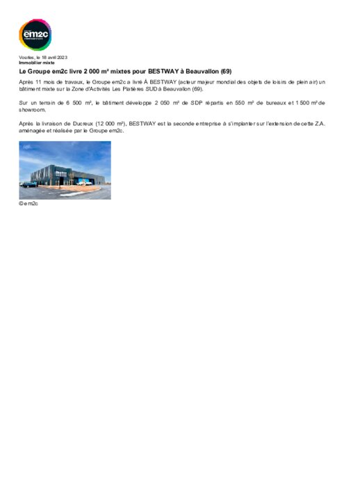 Après 11 mois de travaux, le Groupe em2c a livré À BESTWAY (acteur majeur mondial des objets de loisirs de plein air) un bâtiment mixte sur la Zone d'Activités Les Platières SUD à Beauvallon (69).