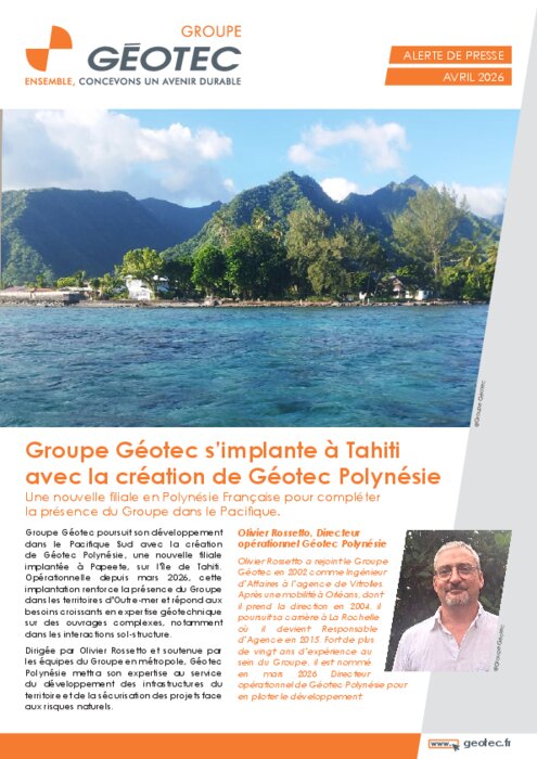 Groupe Géotec poursuit son développement dans le Pacifique Sud avec la création de Géotec Polynésie, une nouvelle filiale implantée à Papeete, sur l’île de Tahiti. Opérationnelle depuis mars 2026, cette implantation renforce la présence du Groupe dans les territoires d’Outre-mer et répond aux besoins croissants en expertise géotechnique sur des ouvrages complexes, notamment dans les interactions sol-structure.