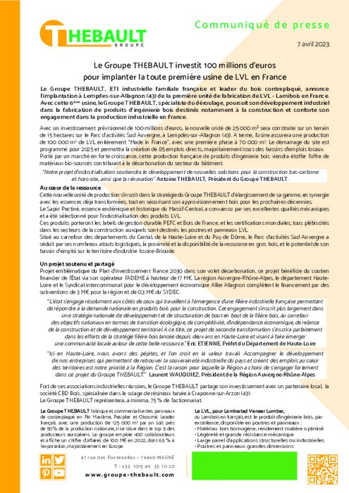 Le Groupe THEBAULT, ETI industrielle familiale française et leader du bois contreplaqué, annonce l’implantation à Lempdes-sur-Allagnon (43) de la première unité de fabrication de LVL - Lamibois en France.