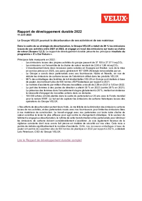 Dans le cadre de sa stratégie de décarbonation, le Groupe VELUX a réduit de 26 % les émissions issues de ses activités entre 2021 et 2022, et engagé un recul des émissions sur toute sa chaîne de valeur (Scopes 1,2,3). Le rapport de développement durable présente les principaux résultats du programme « It’s Our Nature ».