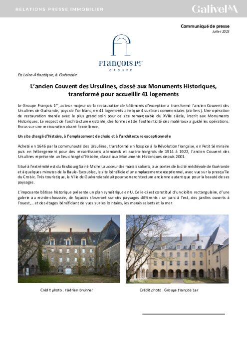 Le groupe François 1er, acteur majeur de la restauration de bâtiments d’exception a transformé l’ancien Couvent des Ursulines de Guérande, pays de l’or blanc, en 41 logements ainsi que 4 surfaces commerciales (ateliers). Une opération de restauration menée avec le plus grand soin pour ce site remarquable du XVIIe siècle, inscrit aux Monuments Historiques.