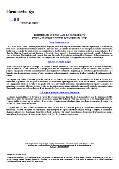 La marque Haemmerlin, leader sur le marché des équipements de manutention et des brouettes propose une boutique en ligne de pièces détachées. L’e-shop du fabricant français permet d’acheter et de se faire livrer des pièces de remplacement pour tous les modèles de brouettes, sans se déplacer. Une initiative qui s'inscrit dans une démarche de développement durable et de respect de l'environnement, en permettant de prolonger la durée de vie de ses équipements, tout en adoptant une approche responsable et économique.