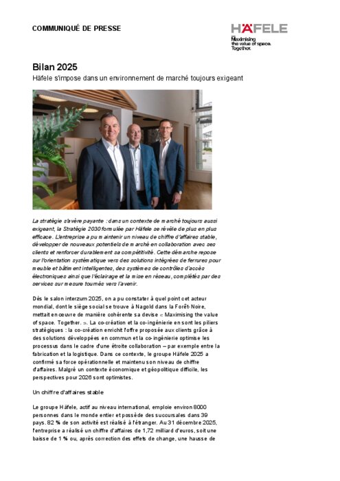 La stratégie s'avère payante : dans un contexte de marché toujours aussi exigeant, la Stratégie 2030 formulée par Häfele se révèle de plus en plus efficace. L'entreprise a pu maintenir un niveau de chiffre d'affaires stable, développer de nouveaux potentiels de marché en collaboration avec ses clients et renforcer durablement sa compétitivité. Cette démarche repose sur l'orientation systématique vers des solutions intégrées de ferrures pour meuble et bâtiment intelligentes, des systèmes de contrôles d’accès électroniques ainsi que l'éclairage et la mise en réseau, complétés par des services sur mesure tournés vers l’avenir.