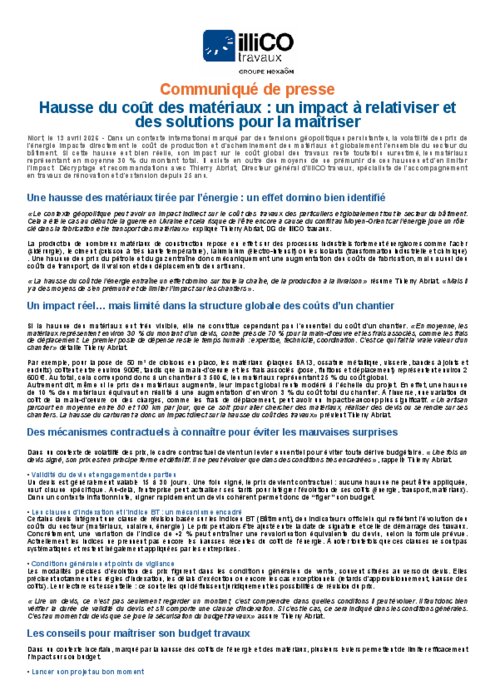 Dans un contexte international marqué par des tensions géopolitiques persistantes, la volatilité des prix de l’énergie impacte directement le coût de production et d’acheminement des matériaux et globalement l’ensemble du secteur du bâtiment. Si cette hausse est bien réelle, son impact sur le coût global des travaux reste toutefois surestimé, les matériaux représentant en moyenne 30 % du montant total. Il existe en outre des moyens de se prémunir de ces hausses et d’en limiter l’impact. Décryptage et recommandations avec Thierry Abriat, Directeur général d’illiCO travaux, spécialiste de l’accompagnement en travaux de rénovation et d’extension depuis 25 ans.