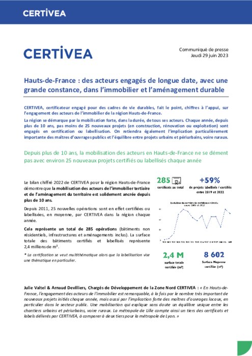 Certivea, certificateur engagé pour des cadres de vie durables, fait le point, chiffres à l’appui, sur l’engagement des acteurs de l’immobilier de la région Hauts-de-France. La région se démarque par la mobilisation forte, dans la durée, de tous ses acteurs. Chaque année, depuis plus de 10 ans, pas moins de 25 nouveaux projets (en construction, rénovation ou exploitation) sont engagés en certification ou labellisation.