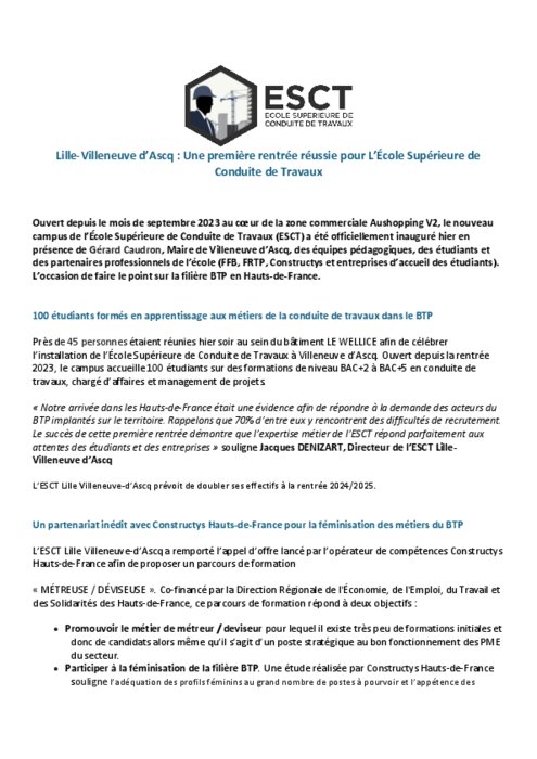 Ouvert depuis le mois de septembre 2023 au cœur de la zone commerciale Aushopping V2, le nouveau campus de l’École Supérieure de Conduite de Travaux (ESCT) a été officiellement inauguré hier en présence de Gérard Caudron, Maire de Villeneuve d’Ascq, des équipes pédagogiques, des étudiants et des partenaires professionnels de l’école (FFB, FRTP, Constructys et entreprises d’accueil des étudiants). L’occasion de faire le point sur la filière BTP en Hauts-de-France.