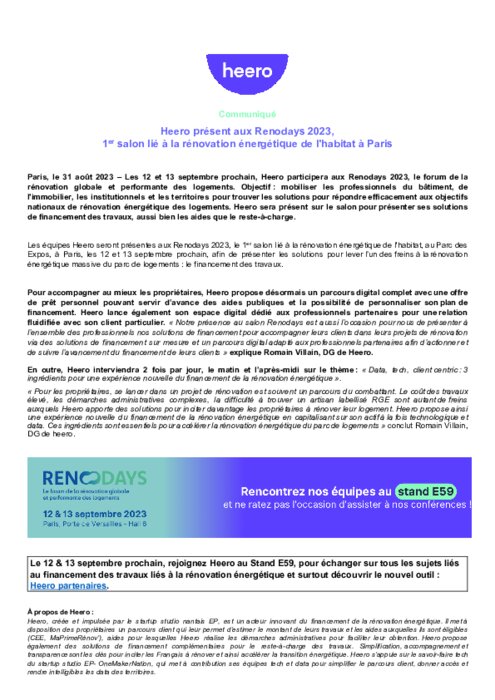 Les équipes Heero seront présentes aux Renodays 2023, le 1er salon lié à la rénovation énergétique de l'habitat, au Parc des Expos, à Paris, les 12 et 13 septembre prochain, afin de présenter les solutions pour lever l’un des freins à la rénovation énergétique massive du parc de logements : le financement des travaux.