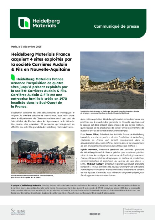 Industriels 02 décembre 2025 - 13:31 Heidelberg Materials France annonce l’acquisition de quatre sites jusqu’à présent exploités par la société Carrières Audoin & Fils. Carrières Audoin & Fils est une entreprise familiale créée en 1970 localisée dans le Sud-Ouest de la France. PDF (716 Ko) Télécharger