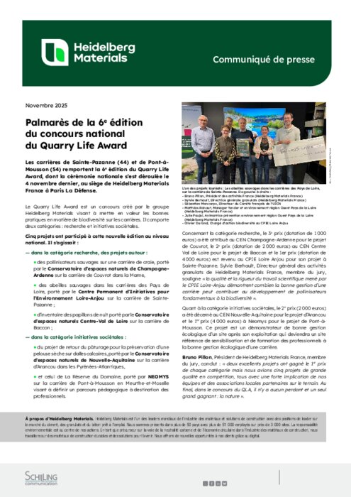 Industriels 21 novembre 2025 - 10:11 Le Quarry Life Award est un concours créé par le groupe Heidelberg Materials visant à mettre en valeur les bonnes pratiques en matière de biodiversité sur les carrières. Il comporte deux catégories : recherche et initiatives sociétales. PDF (251 Ko) Télécharger