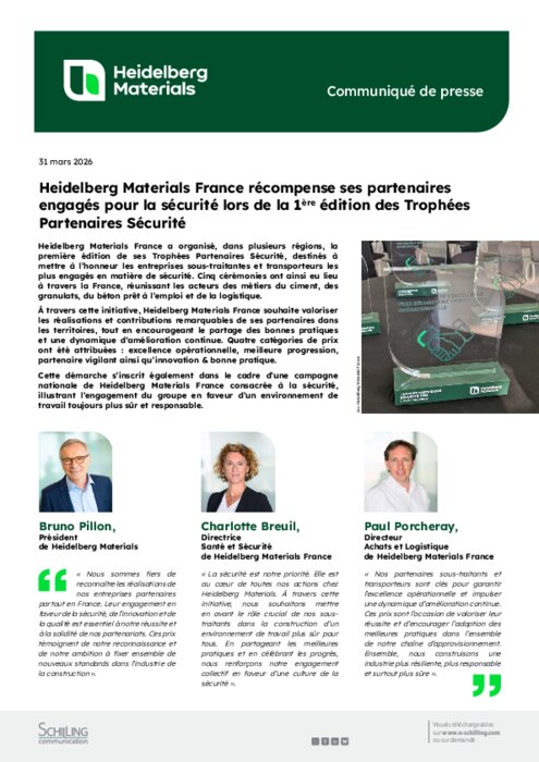 Heidelberg Materials France a organisé, dans plusieurs régions, la première édition de ses Trophées Partenaires Sécurité, destinés à mettre à l’honneur les entreprises sous-traitantes et transporteurs les plus engagés en matière de sécurité. Cinq cérémonies ont ainsi eu lieu à travers la France, réunissant les acteurs des métiers du ciment, des granulats, du béton prêt à l’emploi et de la logistique.
