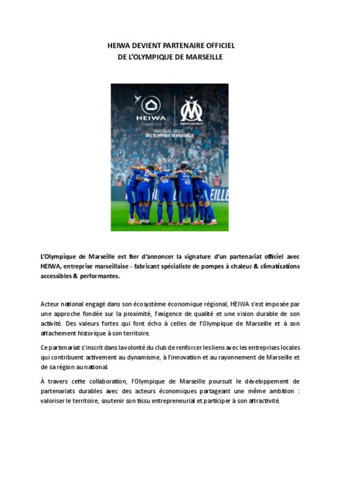 Industriels 26 janvier 2026 - 12:08 HEIWA, entreprise spécialiste des solutions de chauffage et de climatisation accessibles et performantes, annonce la signature d’un partenariat officiel avec l’Olympique de Marseille. PDF (266 Ko) Télécharger