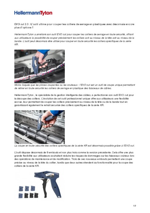 HellermannTyton a amélioré son outil EVO cut pour couper les colliers de serrage en toute sécurité, offrant aux utilisateurs la possibilité de couper précisément les colliers soit au niveau de la tête soit au niveau de la bande. L'outil peut désormais être utilisé pour couper en toute sécurité les colliers spécifiques de la série KR.