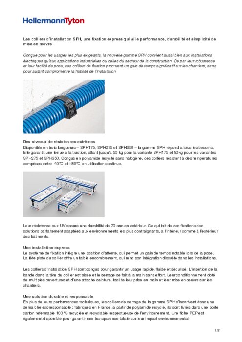 Conçue pour les usages les plus exigeants, la nouvelle gamme SPH convient aussi bien aux installations électriques qu’aux applications industrielles ou celles du secteur de la construction. De par leur robustesse et leur facilité de pose, ces colliers de fixation procurent un gain de temps significatif sur les chantiers, sans pour autant compromettre la fiabilité de l’installation.