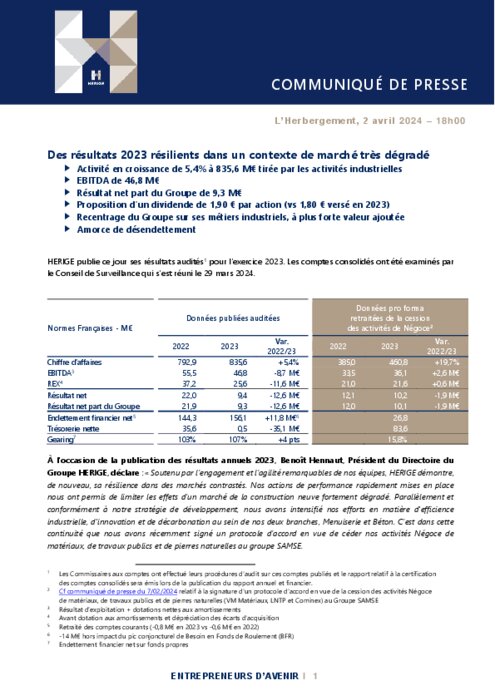 Au titre de l’exercice 2023, HERIGE réalise un chiffre d’affaires de 835,6 M€ en hausse de 5,4% (-3,2% à périmètre