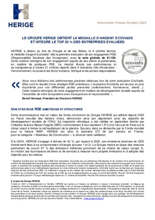 HERIGE a obtenu au titre du Groupe et de ses filiales, le 9 octobre dernier, la médaille d’argent EcoVadis dès la première évaluation de son engagement RSE (Responsabilité Sociétale des Entreprises), avec la note globale de 61/100.