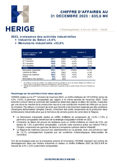 HERIGE réalise sur le 4ème trimestre de l'exercice 2023, un chiffre d'affaires de 197,6 M€ en retrait de 4,2% (-9,8% à périmètre comparable) par rapport à la même période de l'exercice 2022. Cette évolution s'inscrit dans la continuité des tendances observées depuis le début de l'année, marquées par une chute du marché de la construction neuve et une contribution moindre de l'effet prix au cours du trimestre.