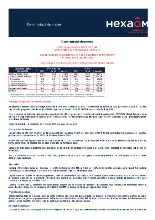 Au quatrième trimestre 2025, le Groupe Hexaom renoue avec la croissance avec une production en hausse de +5,5 % par rapport à 2024 à 173,3 M€. La production progresse dans toutes les activités. À périmètre constant, le chiffre d’affaires est en repli limité de -2,8 %.