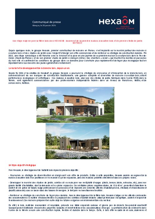 Depuis quelques mois, le groupe Hexaom, premier constructeur de maisons en France, s’est implanté sur le marché porteur des maisons à ossature bois et des studios de jardin avec l'objectif d'élargir son offre commerciale et de renforcer sa stratégie de construction durable. Fin 2025, une étape symbolique a été franchie avec la livraison et la pose en une journée de sa première maison à ossature bois dans le Pas-deCalais (Hauts-de-France), et de son premier studio de jardin à Alençon (Orne). Des chantiers « éclair » qui illustrent la montée en puissance du hors-site et confirment les ambitions du groupe dans ce domaine pour construire plus rapidement et de façon plus écologique tout en répondant ainsi aux besoins des jeunes générations notamment.