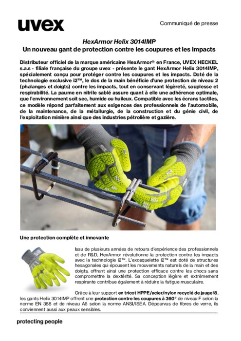 Distributeur officiel de la marque américaine HexArmor® en France, UVEX HECKEL s.a.s - filiale française du groupe uvex - présente le gant HexArmor Helix 3014IMP, spécialement conçu pour protéger contre les coupures et les impacts. Doté de la technologie exclusive i2™, le dos de la main bénéficie d’une protection de niveau 2 (phalanges et doigts) contre les impacts, tout en conservant légèreté, souplesse et respirabilité. La paume en nitrile sablé assure quant à elle une adhérence optimale, que l’environnement soit sec, humide ou huileux. Compatible avec les écrans tactiles, ce modèle répond parfaitement aux exigences des professionnels de l’automobile, de la maintenance, de la métallurgie, de la construction et du génie civil, de l’exploitation minière ainsi que des industries pétrolière et gazière.