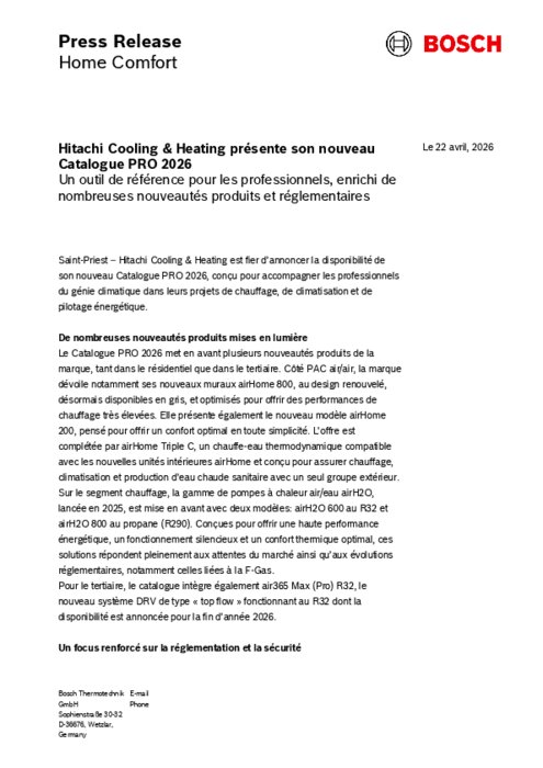 Industriels 22 avril 2026 - 10:12 Hitachi Cooling & Heating est fier d’annoncer la disponibilité de son nouveau Catalogue PRO 2026, conçu pour accompagner les professionnels du génie climatique dans leurs projets de chauffage, de climatisation et de pilotage énergétique. PDF (132 Ko) Télécharger credit Hitachi