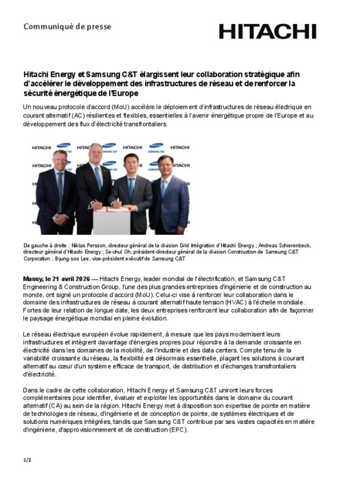 Hitachi Energy et Samsung C&T élargissent leur collaboration stratégique