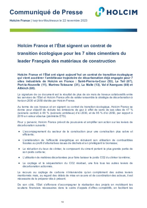 Holcim France et l’État ont signé un contrat de transition écologique qui vient accélérer l’ambitieuse trajectoire de décarbonation déjà engagée pour 7 sites industriels de Holcim en France : Saint-Pierre-la-Cour (53), Le Teil (07),