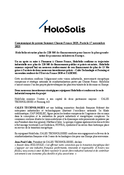 Un an après sa mise à l’honneur à Choose France, HoloSolis confirme sa trajectoire industrielle avec plus de 220 M€ de financements publics et privés sécurisés.. HoloSolis annonce aujourd’hui un nouveau renforcement de son financement de plus de 13 Me grâce à l’arrivée de deux nouveaux investisseurs privés – Calés Technologie et Forming et un soutien renforcé de l’Etat via France 2030 et l’ADEME.