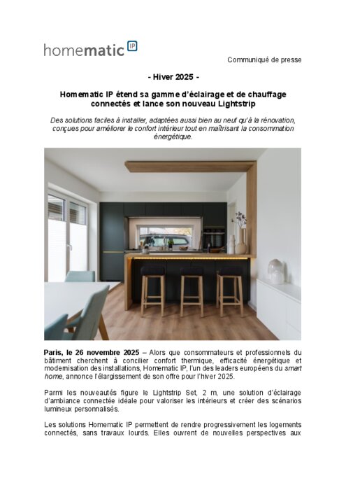 Homematic IP, l’un des leaders européens du smart home, annonce l’élargissement de son offre pour l’hiver 2025. Parmi les nouveautés figure le Lightstrip Set, 2 m, une solution d’éclairage d’ambiance connectée idéale pour valoriser les intérieurs et créer des scénarios lumineux personnalisés.