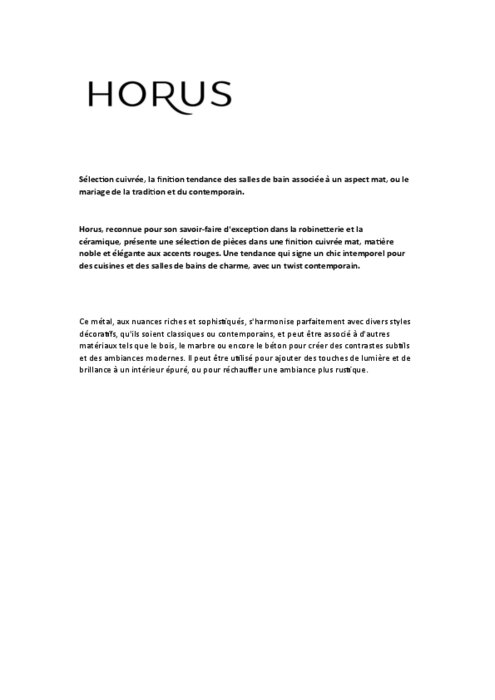 Horus, reconnue pour son savoir-faire d'exception dans la robinetterie et la céramique, présente une sélection de pièces dans une finition cuivrée mat, matière noble et élégante aux accents rouges. Une tendance qui signe un chic intemporel pour des cuisines et des salles de bains de charme, avec un twist contemporain.