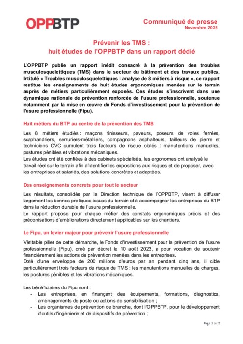 L’OPPBTP publie un rapport inédit consacré à la prévention des troubles musculosquelettiques (TMS) dans le secteur du bâtiment et des travaux publics. Intitulé « Troubles musculosquelettiques : analyse de 8 métiers à risque », ce rapport restitue les enseignements de huit études ergonomiques menées sur le terrain auprès de métiers particulièrement exposés. Ces études s’inscrivent dans une dynamique nationale de prévention renforcée de l’usure professionnelle, soutenue notamment par la mise en oeuvre du Fonds d’investissement pour la prévention de l’usure professionnelle (Fipu).
