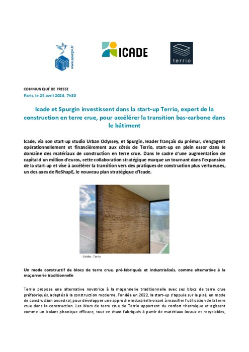 Icade, via son start-up studio Urban Odyssey, et Spurgin, leader français du prémur, s'engagent opérationnellement et financièrement aux côtés de Terrio, start-up en plein essor dans le domaine des matériaux de construction en terre crue. Dans le cadre d'une augmentation de capital d'un million d'euros, cette collaboration stratégique marque un tournant dans l'expansion de la start-up et vise à accélérer la transition vers des pratiques de construction plus vertueuses, un des axes de ReShapE, le nouveau plan stratégique d’Icade.