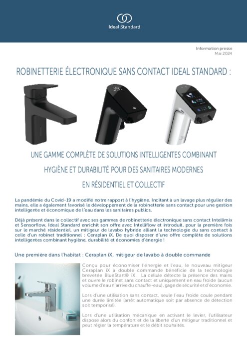Déjà présent dans le collectif avec ses gammes de robinetterie électronique sans contact Intellimix et Sensorflow, Ideal Standard enrichit son offre avec Intelliflow et introduit, pour la première fois sur le marché résidentiel, un mitigeur de lavabo hybride alliant la technologie du sans contact à celle d’un robinet traditionnel : Ceraplan iX. De quoi disposer d’une offre complète de solutions intelligentes combinant hygiène, durabilité et économies d’énergie.
