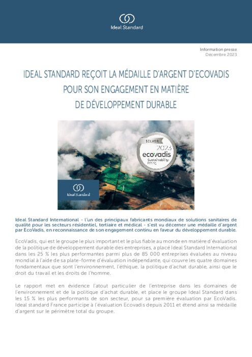 Ideal Standard International - l’un des principaux fabricants mondiaux de solutions sanitaires de qualité pour les secteurs résidentiel, tertiaire et médical - vient de recevoir une médaille d’argent par EcoVadis, en reconnaissance de son engagement continu en faveur du développement durable.